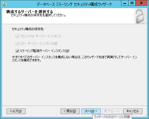 ミラーリング監視サーバーに接続できたら「次へ」をクリックします。