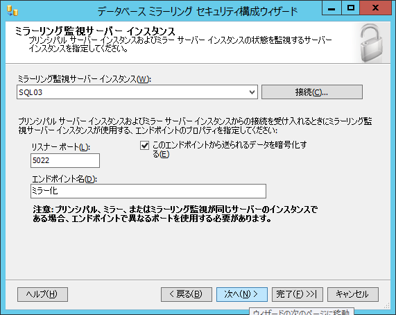 「ワークグループ環境で データベースミラーリングを構築する ~ 手順 3 ~ 」