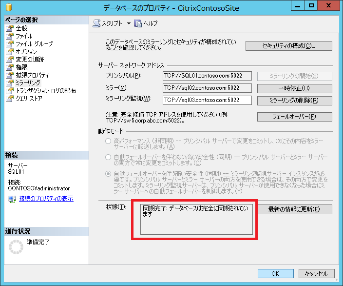 しばらくの後、「状態」の項目が「動機完了:データベースは完全に動機されています」という表記に変わればミラーリング成功です。