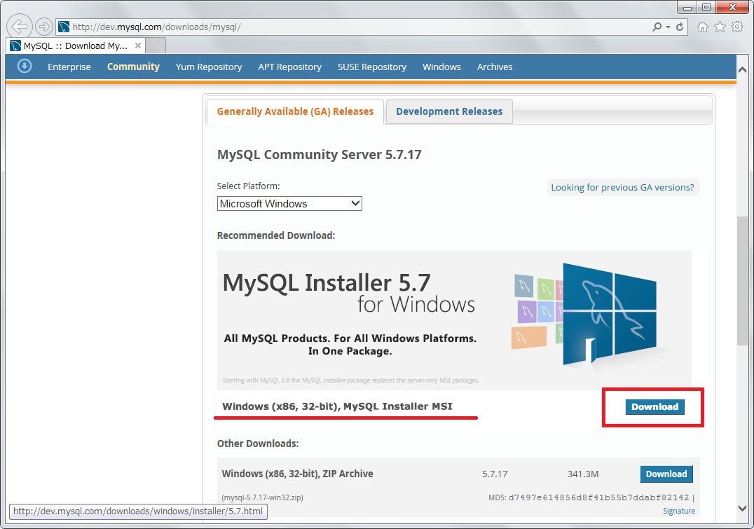 MySQL パッケージをダウンロードする