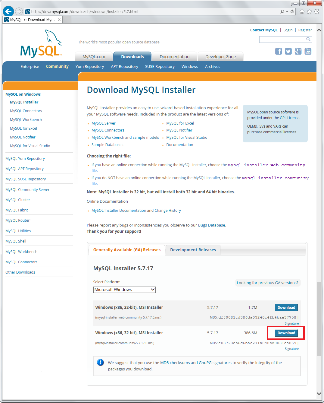 MySQL 5.7.17.0 パッケージをインストールする