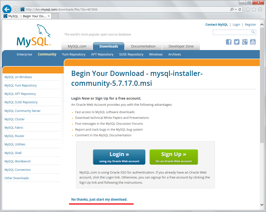 アカウントを持っていない場合は作成することもできますが、急ぎの場合やとりあえずお試しでという場合は「No thanks,just start my download.」 というリンクをクリックするとアカウントを登録しなくてもダウンロードできます。