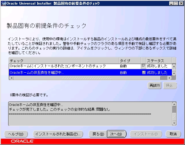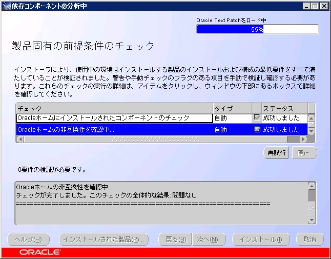 「事前準備」に記載したようにOracle 関係のサービスを停止して「再試行」をクリックします。
