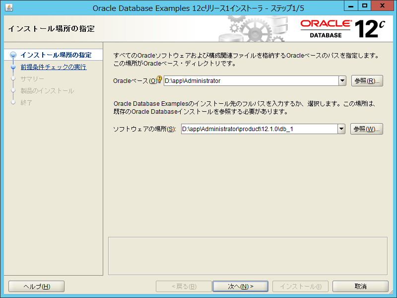 「ソフトウェアの場所」を既にインストールされているOracle Database 12c の場所を指定します。