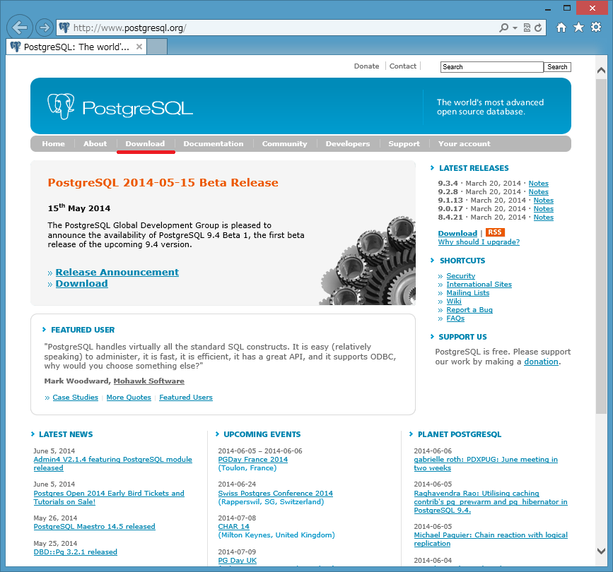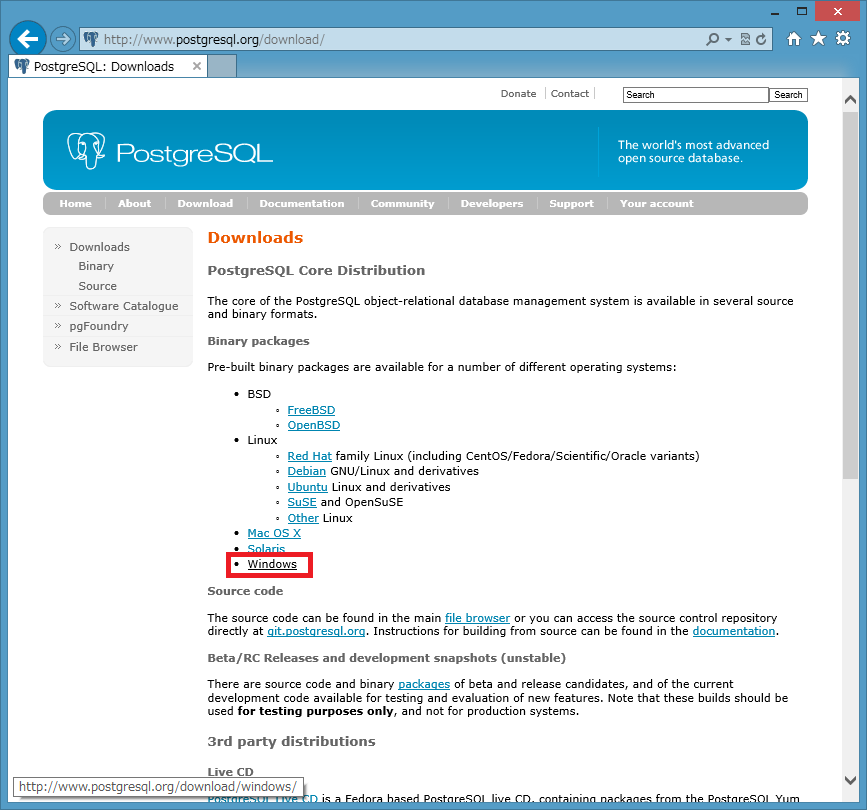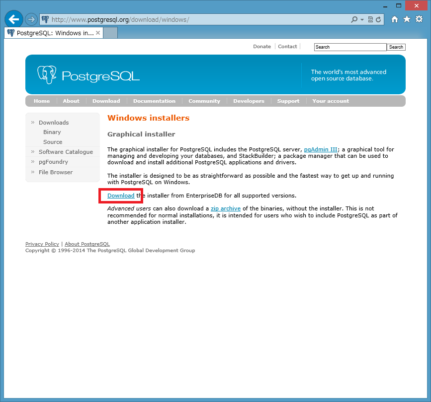 - PostgreSQL サイトのトップページから「Download」をクリックします。