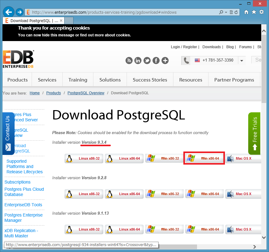 今回は 現状最新版の 9.3.4 を Windows Server 2008 R2 へインストールしますので「Version 9.3.4」の欄の「Win x86-64」をクリックしてダウンロードします。
