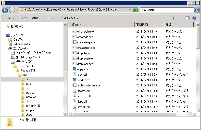 PostgreSQL インストールしたディレクトリを確認します。