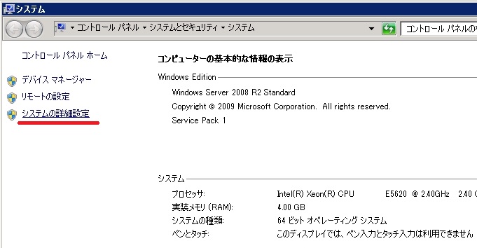 左ペインから「システムの詳細設定」をクリックします。