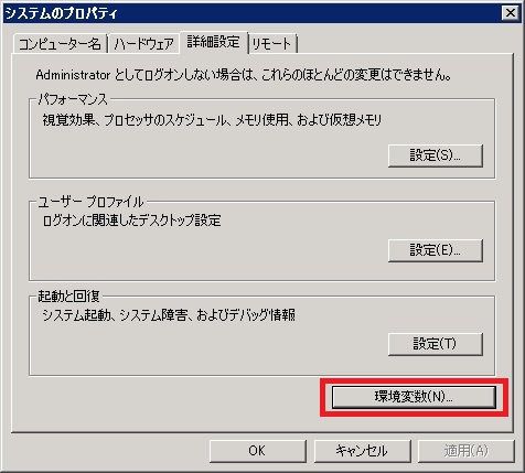 ダイアログ下部の「環境変数」をクリックします。
