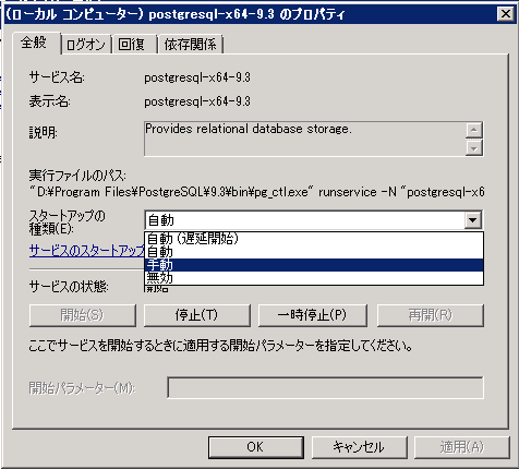 OS起動時に自動的に起動させたくない場合はプロパティを起動して「スタートアップ種類」の項目を「手動」にします。