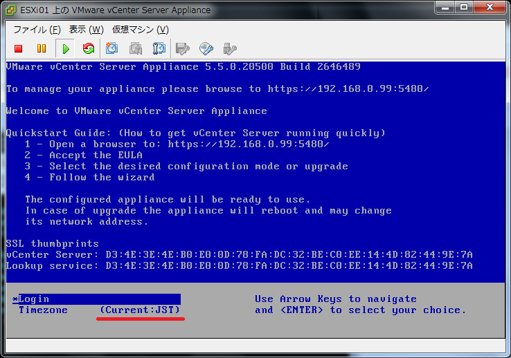 初期設定のログインは「root」、パスワードは「vmware」です。