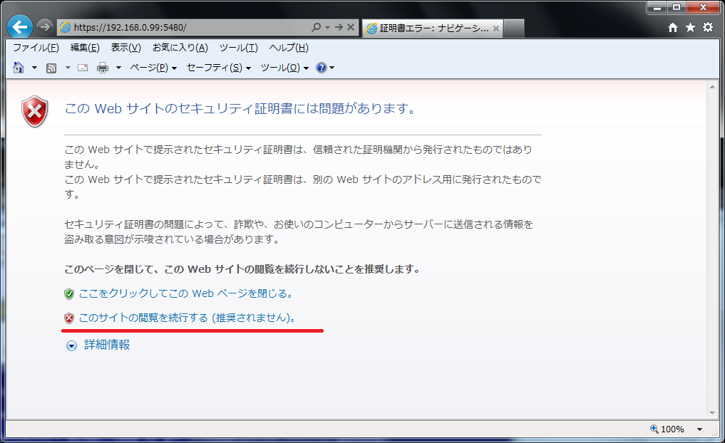 「このサイトの閲覧を続行する(推奨されません)」をクリックします。