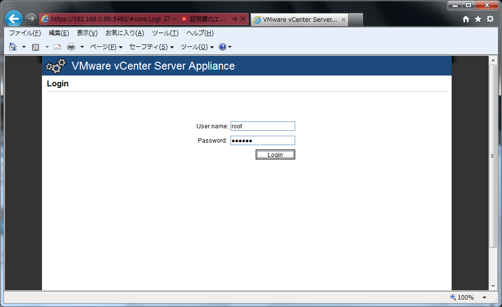 クリックで拡大 - vCenterのログイン画面が表示されますのでログインとパスワードを入力してログインします。