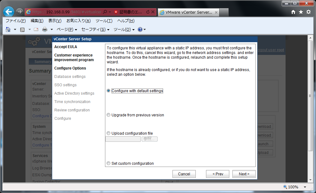 vCenter Server の管理コンソールを初期設定する