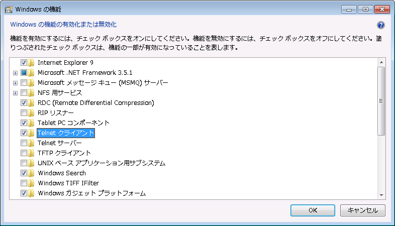 Windows の機能 一覧で「Telnet クライアント」にチェックを入れて「OK」をクリックします。