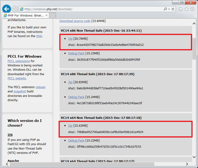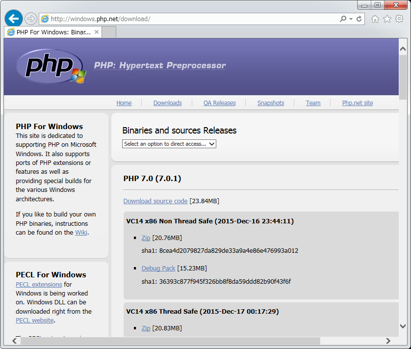 http://windows.php.net/download へアクセスします。
