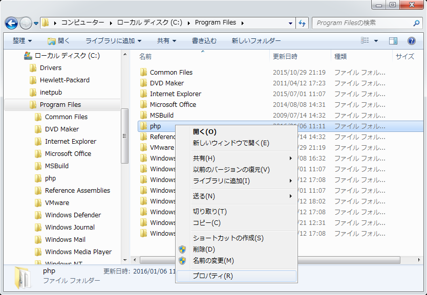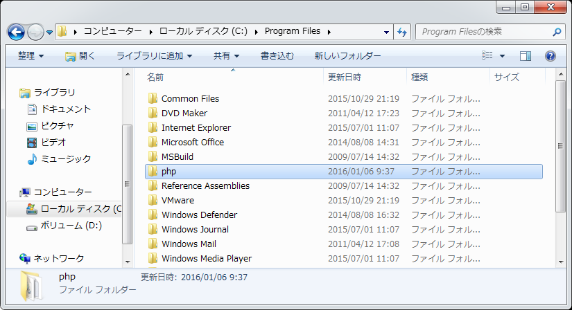 今回は「C:\Program Files」に「php」というフォルダを作成しました。