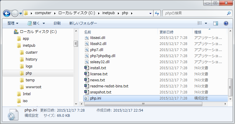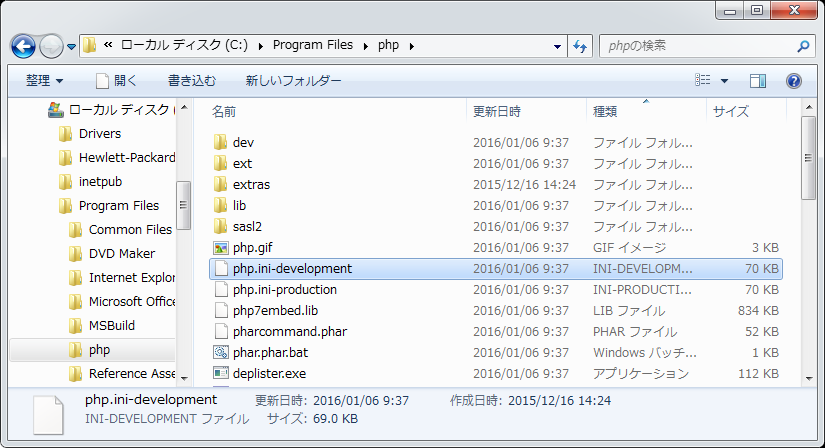 クリックで拡大 - フォルダ内にある「php.ini-development」ファイルをコピーしてファイル名を「php.ini」に変更します。