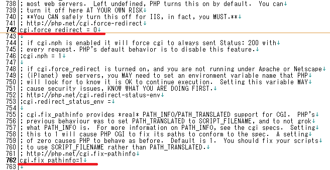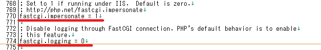 ※行数は参考程度です。バージョンによって異なるかもしれません。行数 項目 値 説明 742行目 cgi.force_redirect 0 先頭の「;」をとって値を「0」に変更 762行目 cgi.fix_pathinfo 1 先頭の「;」をとって値を「1」に変更 770行目 fastcgi.impersonate 1 先頭の「;」をとる 774行目 fastcgi.logging 0 先頭の「;」をとる