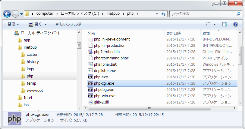 エラーメッセージが表示された場合は 「IIS 環境に PHP をインストール時、「php-cgi.exe」を実行するとエラーが発生する」 を参考にして対応してください。