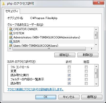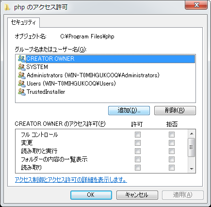 クリックで拡大 - 次に「php」フォルダのアクセス権を設定します。