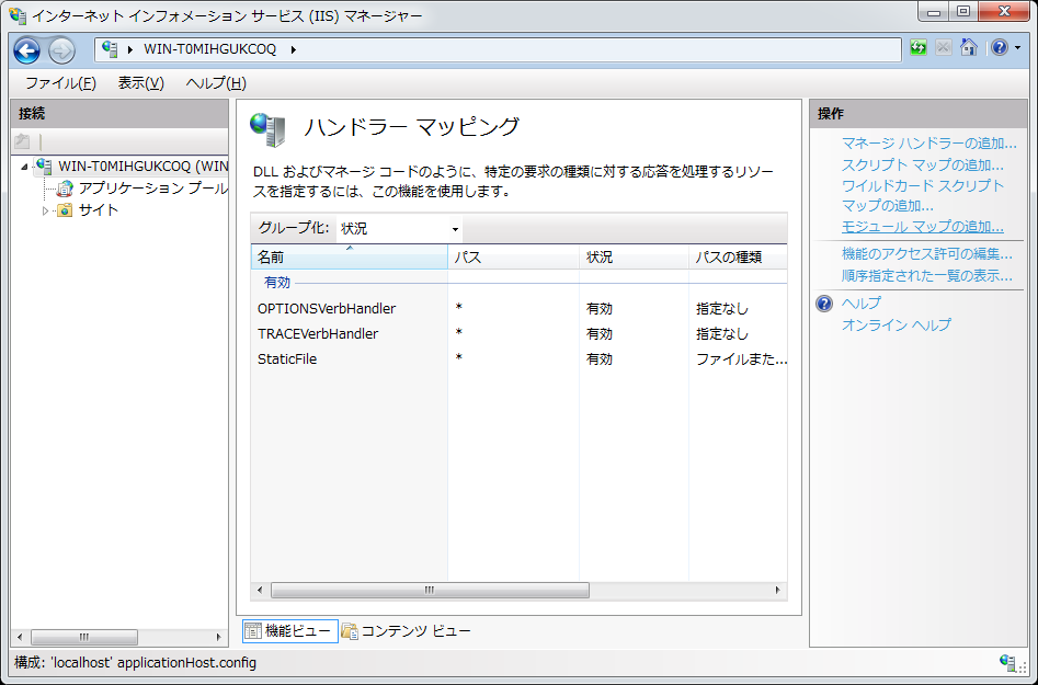 モジュールの一覧にない場合は以下のページを参考に、IISにCGIをインストールします。
