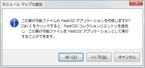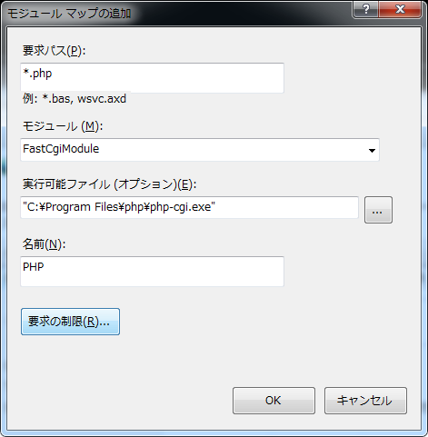 「モジュール」の欄は右にある▼をクリックして一覧から選択します。要求パス *.php モジュール FastCgiModule 実行可能ファイル <上記インストール手順の1で作ったフォルダ>\php-cgi.exe 名前 PHP(わかりやすい名前でなんでも可)