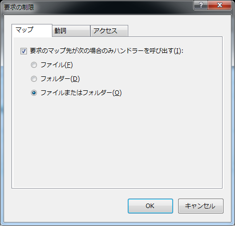 クリックで拡大 - 「マップ」タブで「要求のマップ先が次の場合のみハンドラーを呼び出す」にチェックを入れて「ファイルまたはフォルダー」を選択します。