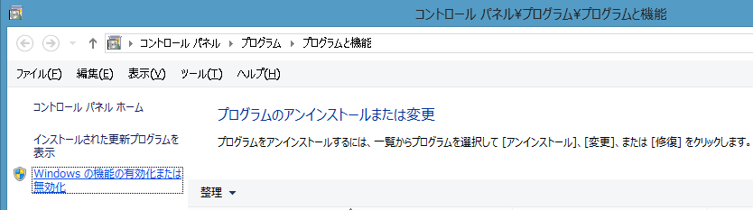 「プログラムと機能」画面が表示されたら左ペインの「Windows の機能の有効化または無効化」をクリックします。