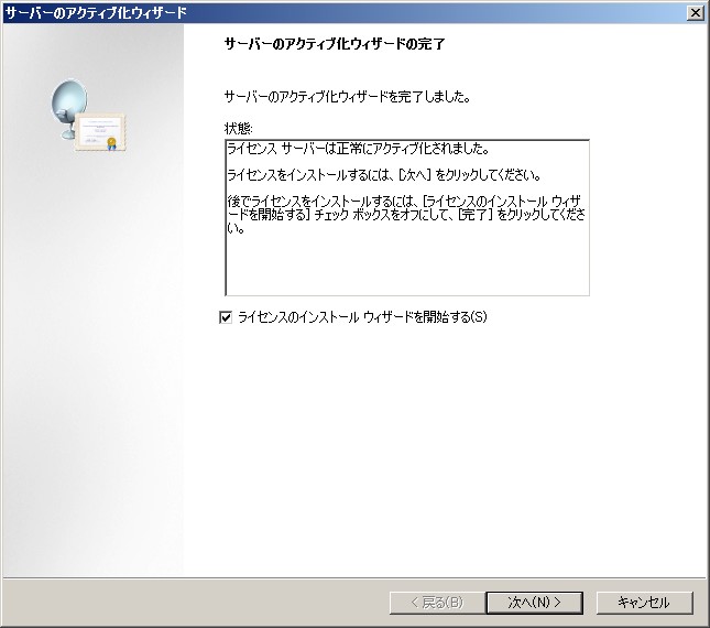 引き続きライセンスをインストールする場合は「ライセンスのインストールウィザードを開始する」をチェックして「次へ」をクリックします。