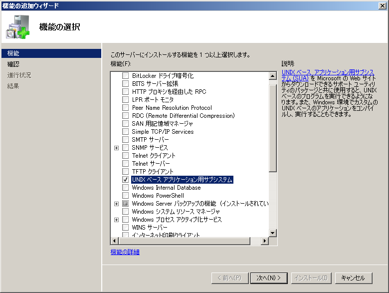 「UNIX ベース アプリケーション用サブシステム」にチェックを入れて「次へ」をクリックします。