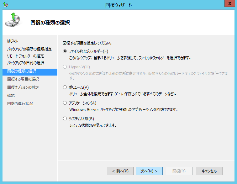 今回はファイルを復元するので「ファイルおよびフォルダー」を選択します。