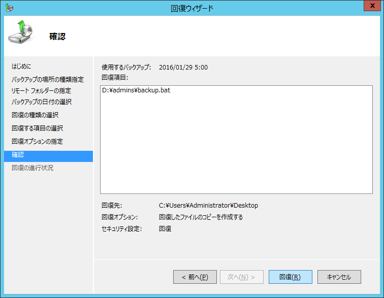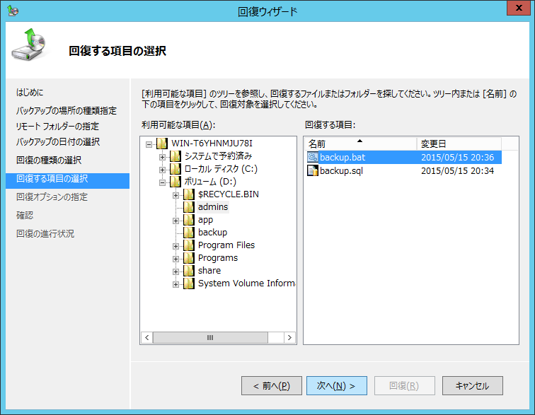 Windows Server バックアップで保存されたバックアップファイルからデータを復元する手順です。