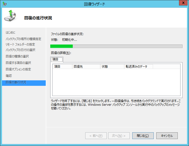 バックアップの復元が完了したら「閉じる」ボタンでウィザードを終了します。