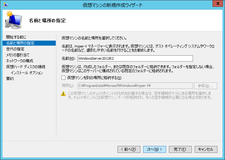 仮想マシンの保存先を既定のフォルダ以外に保存する場合は保存先を指定します。