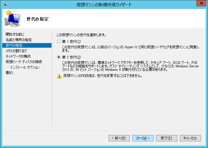 仮想環境に Windows Server 2012 以降か Windows 8 x64 以降の環境をインストールする場合は「第2世代」を選択します。