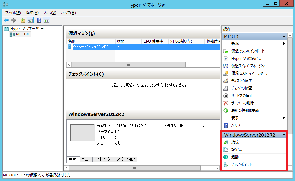 画面右の操作ペインでは仮想マシンに対する操作コマンドは下に表示されています。