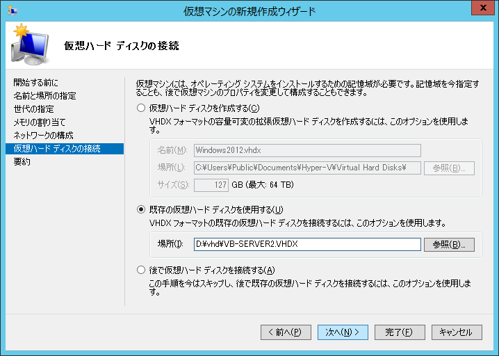 ここで新規の仮想ハードディスクを作成するのではなく、先ほど仮想化した VHD を指定して仮想マシンを作成します。