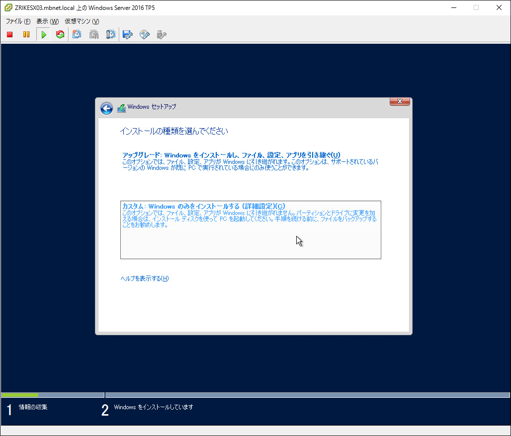 クリックで拡大 - 今回は新規インストールを行いますので「カスタム」の方をクリックします。