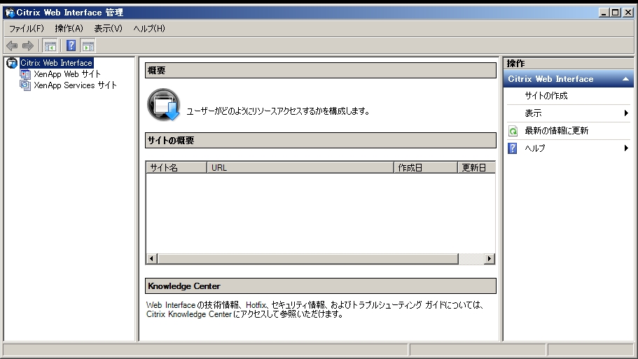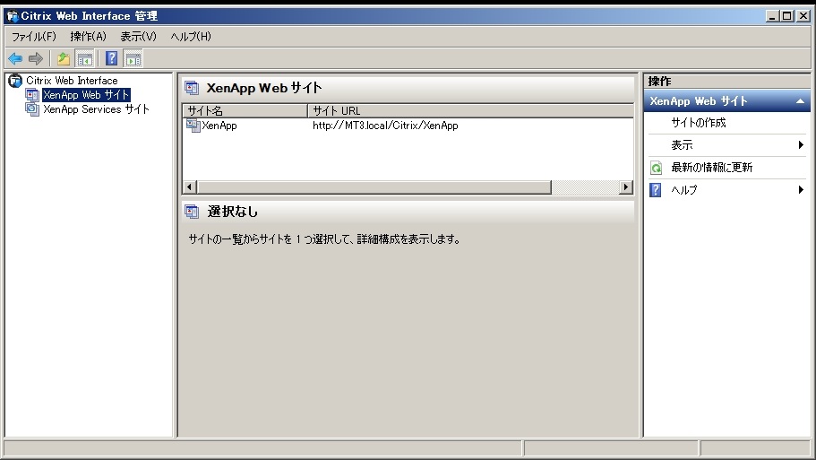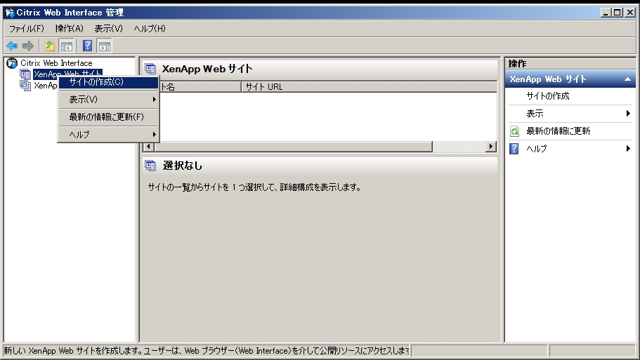 - 左ペインから「XenApp Web サイト」を右クリックし、「サイトの作成」をクリックします。