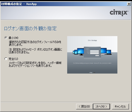 ログオン画面の外観を「最小」にするか「完全」にするか選択して「次へ」をクリックします。