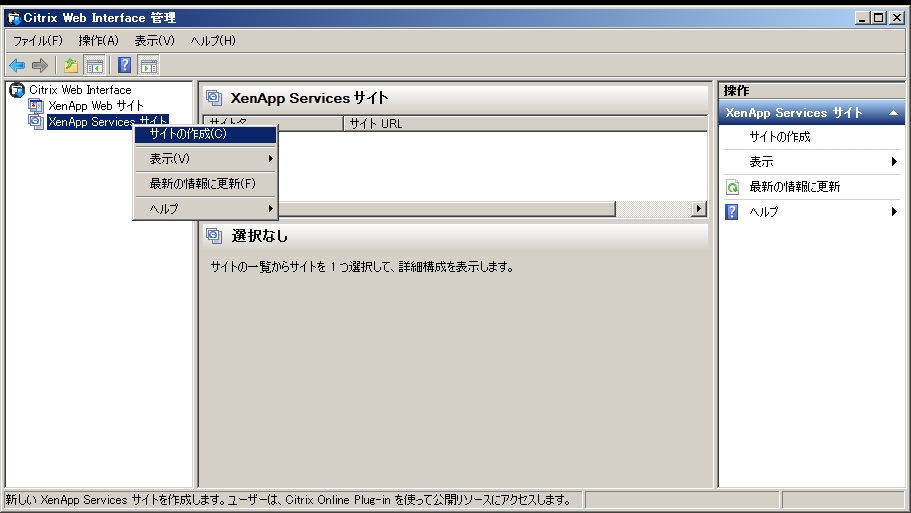 - 左ペインから「XenApp Web Service サイト」を右クリックし、「サイトの作成」をクリックします。