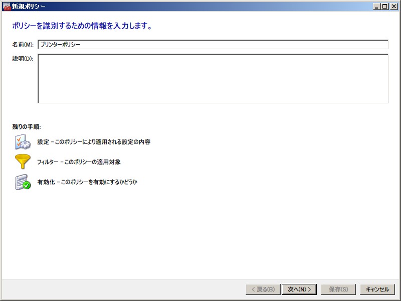 - 「新規」ボタンをクリックして新規ポリシーウィザードを起動します。