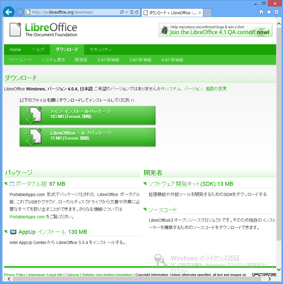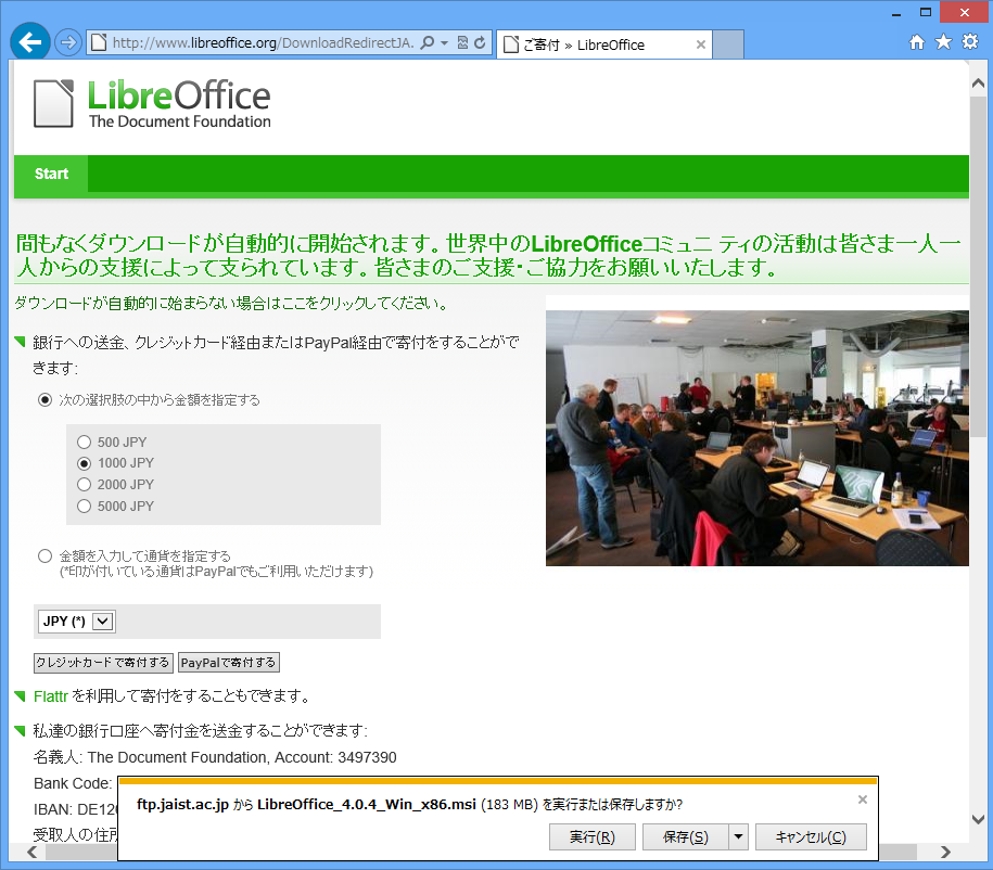 クリックで拡大 - 画面下部に「ftp.jaist.ac.jpからLibreOffice_4.0.4_Win_x86.msi(183MB)を実行または保存しますか?」