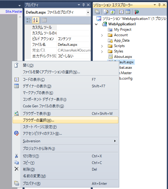 - ソリューションエクスプローラーでプロジェクトの一覧からどれでもいいので aspx ファイルを右クリックして、「ブラウザの選択」をクリックします。