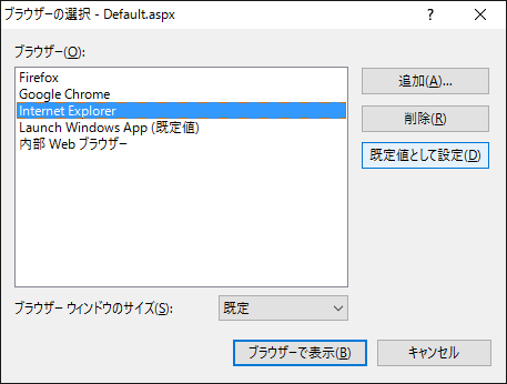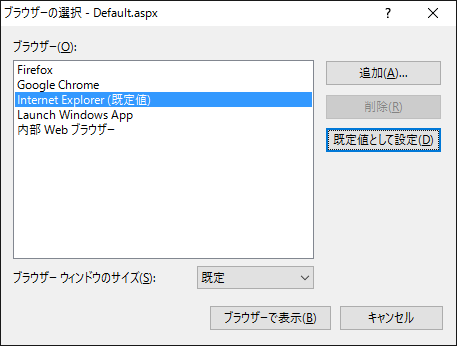 - 表示されているブラウザの一覧からデバッグ実行で使用したいものを選んで「規定値として指定」ボタンをクリックします。