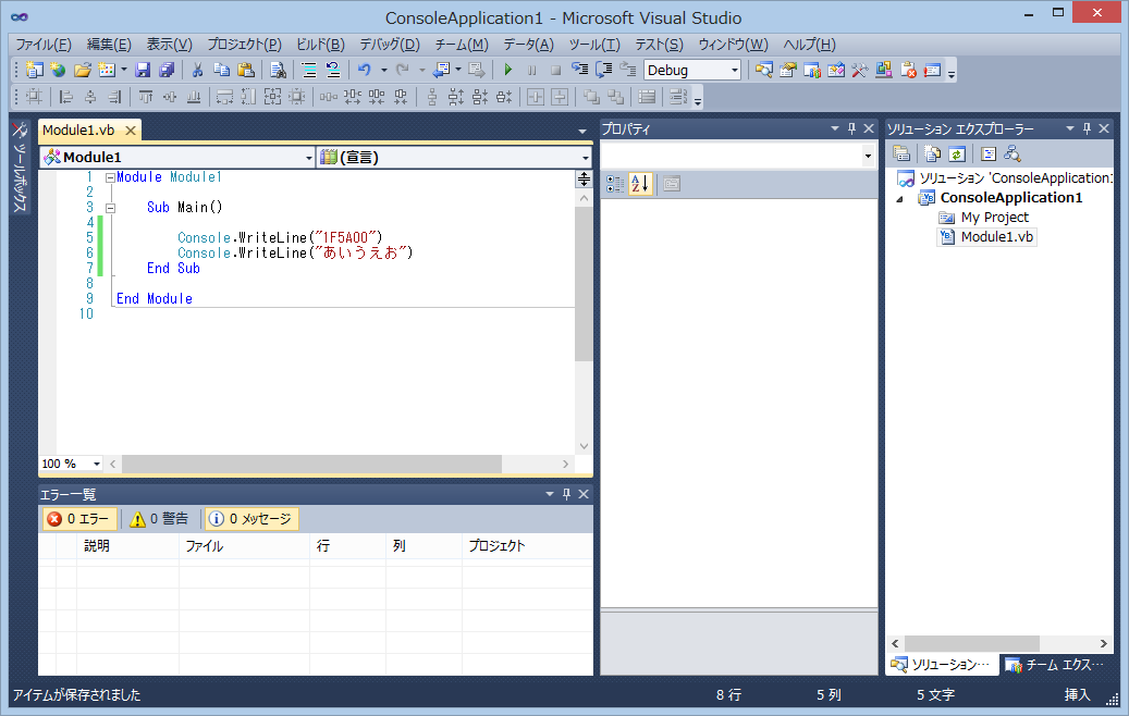 Sub Main() Console.WriteLine("1F5A00") Console.WriteLine("あいうえお") End Sub