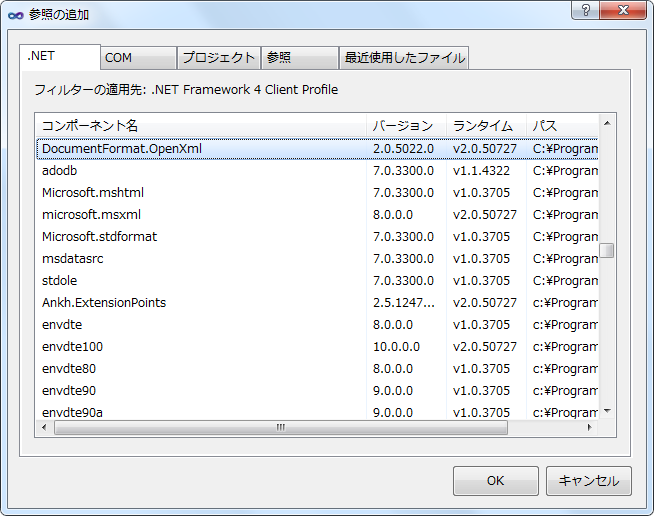 参照設定の画面で「.NET」タブ内の「DocumentFormat.OpenXml」を追加します。