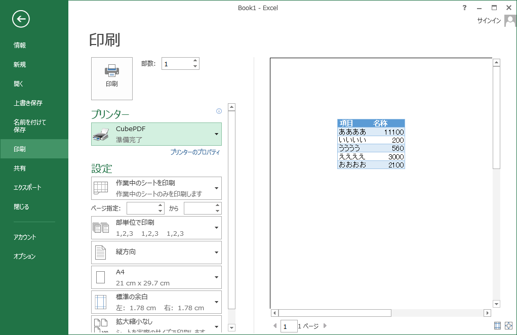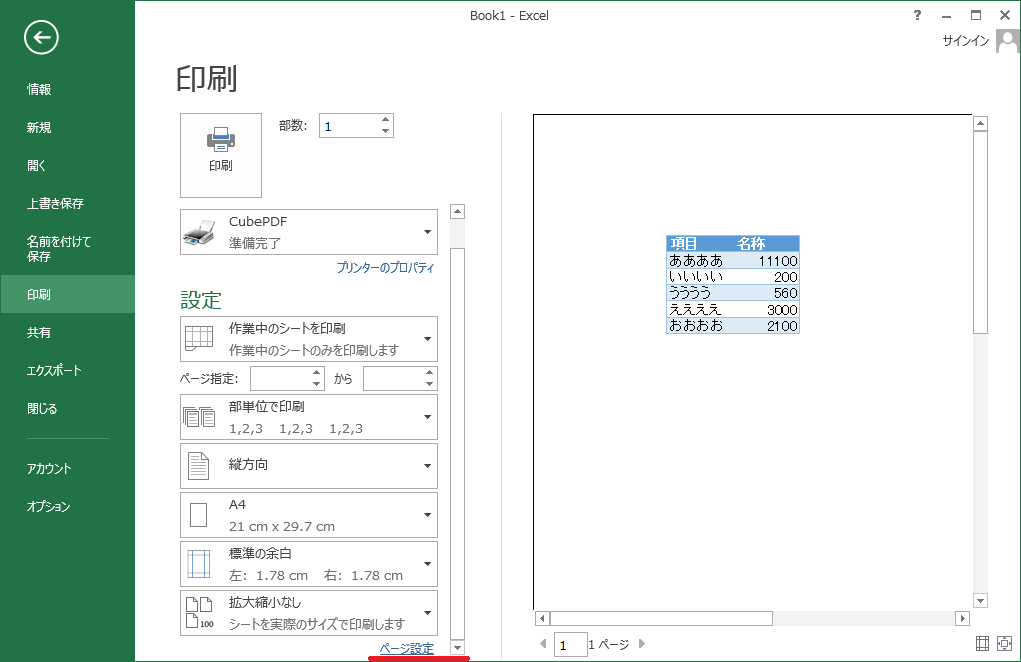 Ctrl+Pで印刷プレビュー画面に移ります。
