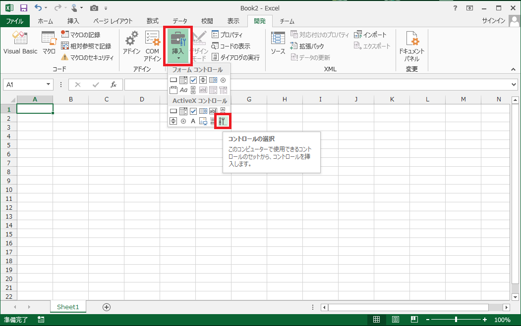 「開発」タブが表示されていない場合はExcel で「開発」タブを表示する方法 を参考して「開発」タブを表示します。